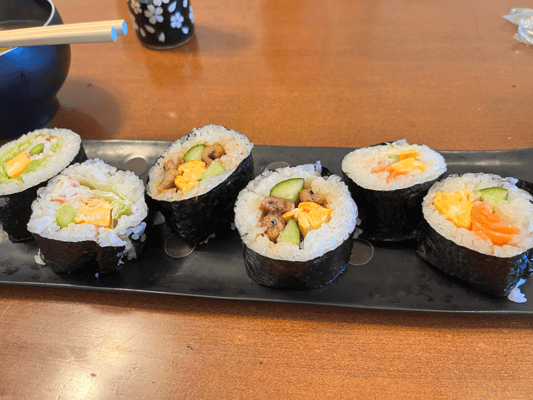 お昼に初めて巻き寿司を作ってみました。サラダ巻き、穴子巻き、サーモン巻き。