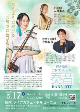 Praised as "the most beautiful concert ever heard" by audiences, Kanae will captivate you with her expressive erhu and gentle vocals. The expressive sound of the erhu, the "Chinese violin," is familiar to many from movie and video game music, and its versatile tone truly shines in Kanae Nozawa’s performance. Joined by renowned composer Tamiya Terashima on keyboard and Maki Furugaki with her stunning simultaneous melodica and piano performance, this concert promises a magical night. Enjoy Studio Ghibli classics like Howl's Moving Castle and My Neighbor Totoro, as well as Tales from Earthsea, composed by Tamiya Terashima, alongside Japanese anime songs, traditional melodies, and Kanae’s original compositions.