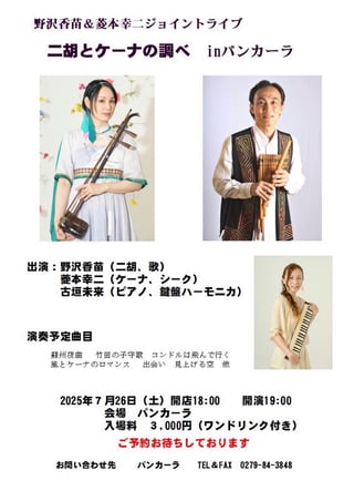 久しぶりの、菱本幸二さんとの二胡とケーナの調べin 北軽井沢!美味しい料理と音楽をお楽しみください。