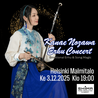 Renowned erhu player Kanae Nozawa, who achieved great success with her 2024 Finland tour across four cities, makes her debut at Cultural Centre Martinus in Vantaa! Having received numerous praises from audiences calling it 'the most beautiful concert they’ve ever heard,' her performance blends delicate yet bold artistry that captivates the heart. Enjoy a night of Japanese traditional music, anime songs, pop tunes, her own original compositions, and notable works by composer Tamajima Tamiaya on keyboard, including the Studio Ghibli soundtrack from Tales from Earthsea. Experience an evening filled with the refreshing breeze of Asia!